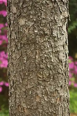 Die leicht harzigen, rötlich braunen Winterknospen sind kegelig-eiförmig. Die geraden oder gebogenen Nadeln sind bei einer Länge von 1,2 bis 2,2 Zentimeter und einer Breite von 0,15 bis 0,18 Zentimeter linear-viereckig geformt und haben einen viereckigen Querschnitt. Ihre Spitze ist spitz zulaufend. Auf allen Nadelseiten befinden sich zwei bis vier Stomatalinien.[1]
