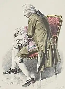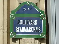 Als eine weitere Kundin lernte er die 34-jährige Madeleine-Catherine Franquet kennen und über sie ihren Mann, einen schon ältlichen und kranken Hofbeamten, der für die Speisen des Königs zuständig war. Er gab die Uhrmacherei auf und kaufte Franquet sein Amt ab. Als dieser bald darauf starb, heiratete Beaumarchais 1756 die Witwe.[15] Diese brachte den kleinen Landsitz Beaumarchet in die Ehe ein, dessen Namen er etwas veränderte und gemäß einem unter reichen Bürgerlichen gängigen Muster an seinen eigentlichen Familiennamen Caron anhängte, um einen adeligen Status zu simulieren. Als seine Frau schon im Jahr darauf starb (vermutlich an einer Infektion), gab es Getuschel und Gerüchte.