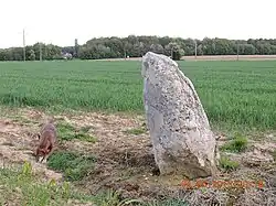 Der kleine Menhir steht in einem Feld etwa in der Mitte der Einfriedung, im Weiler Le Hallier.