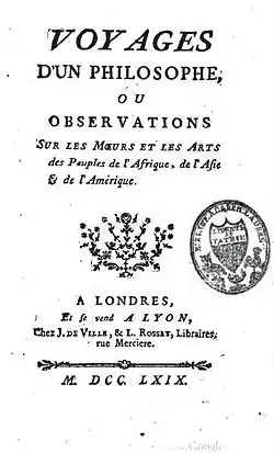 - Voyages d’un philosophe, ou observations sur les moeurs et les arts des peuples de l’Afrique, de l’Asie et de l’Amérique. Yverdon 1768 (Digitalisat).
