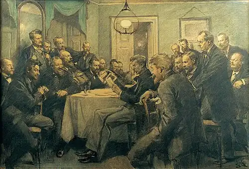 - ↑ Auf dem Bild sieht man J.P. Jacobsen, der die Novelle „Pest in Bergamo“ vorliest, die gerade frisch gedruckt war.