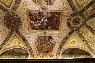 Von 1622 bis 1623 wirkte Pietro Paolo Bonzi an Fresken-Dekorationen in der Galerie des Palazzo Mattei, dabei malte er illusionistische „Stuckreliefs“ mit Putten und Ranken sowie girlandenartige Friese aus Früchten, Gemüse und Blumen, welche die gesamte Decke durchziehen und gliedern, und die an ähnliche Festons erinnern, die Giovanni da Udine in der Villa Farnesina geschaffen hatte.[4][1] Außerdem malte er selber auch zwei der Historienszenen aus dem Leben Salomos (die Salbung und die Hochzeit); die übrigen Szenen ließ er seinen jüngeren Landsmann Pietro da Cortona malen.[2] Ebenfalls für den Marquis Asdrubale Mattei schuf er 1626 mehrere Stillleben von Obst und Blumen.[1]