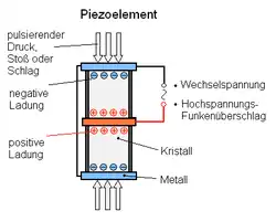 Der piezoelektrische Effekt findet Verwendung in Piezofeuerzeugen, hier wird in einem Piezozünder ein plötzlicher großer Druck (Hammer) verwendet, um eine kurzzeitige hohe elektrische Spannung zu erzeugen. Die Funkenentladung zündet dann die Gasflamme. Aufschlagzünder wie in den Gefechtsköpfen von Panzerabwehrwaffen (Panzerfaust/RPG-7), Piezomikrofone (Kristallmikrofone), Piezo-Lautsprecher in Kopfhörern, batterielose Funkschalter, Piezo-Sirenen und -Summer sind weitere Verwendungen.