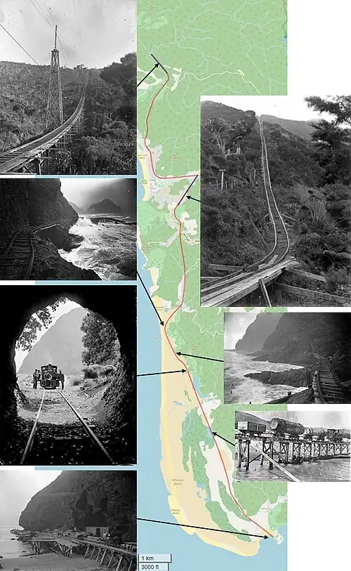 Für die Schmalspurbahn mit einer Spurweite von 3 Fuß (914 mm) wurden Stahlschienen mit einem Metergewicht von 7 bis 14 kg/m auf 125 × 50 mm (5 × 2 Zoll) Holzschwellen verlegt.[2] Ein Großteil der Eisenbahnstrecke entlang der Tasmansee hatte nur eine primitive Qualität. Sie überquerte nur wenige Meter oberhalb des Meeresspiegels weiche Sandstrände und bahnte sich ihren Weg an Felsvorsprüngen entlang und oft an steilen Klippen vorbei. Entlang der Klippen, wo es keine natürliche Trasse für die Strecke gab, wurden Löcher in den Fels gebohrt, in denen die Eisenbahnschwellen befestigt wurden.[1]