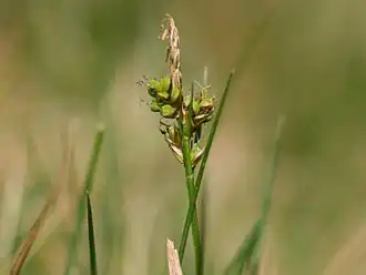 Die Blütezeit reicht von April bis Ende Mai. Der 1,5 bis 2 Zentimeter lange Blütenstand ist aus einem endständigen, am Ende zugespitzten männlichen Ährchen und darunter zwei bis drei weiblichen Ährchen zusammengesetzt. Das männliche Ährchen ist sitzend und bei einer Länge von 5 bis 10 Millimetern sowie bei einem Durchmesser von bis zu 2 Millimetern zylindrisch.[1] Die Spelzen der weiblichen Blüten sind bei einer Länge von etwa 3 Millimetern sowie bei einer Breite von etwa 2 Millimetern eiförmig mit spitzem bis stachelspitzigem oberen Ende; sie sind rot-braun bis dunkel-braun mit grünem Mittelstreifen und weißhäutigen Rändern; selten sind sie ganz grün. Die Schläuche sind bei einer Länge von 1,5 bis 3 Millimetern sowie bei einem Durchmesser von etwa 1,5 Millimetern kugelig bis verkehrt-eiförmig; sie sind hell- bis grau-grün, dicht kurz behaart und nach oben in einen kurzen, etwas ausgerandeten Schnabel verschmälert.[1] Der Fruchtknoten trägt drei Narbe (Botanik), Narben.