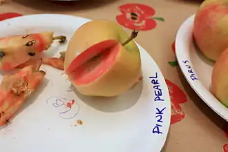 Pink Pearl ist eine Apfelsorte, die 1944 von Albert Etter, einem Züchter aus Nordkalifornien, entwickelt wurde.[1] Er ist ein Sämling von Surprise, einem anderen rosafarbener Apfel, der vermutlich ein Nachfahre von Malus niedzwetskyana ist.