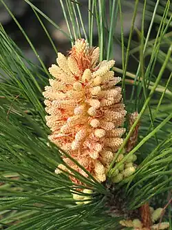 Die Pollenzapfen wachsen spiralig angeordnet in Gruppen nahe der Basis junger Zweige. Die Pollenzapfen sind kurz-zylindrisch und gelb bis orange-braun.