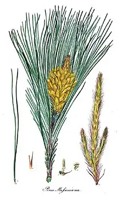- ↑ a b c d Liguo Fu, Nan Li, Thomas S. Elias, Robert R. Mill: Pinus. In: Wu Zheng-yi, Peter H. Raven (Hrsg.): Flora of China, Volume 4: Cycadaceae through Fagaceae. Science Press und Missouri Botanical Garden Press, Beijing und St. Louis, 1999, ISBN 0-915279-70-3. Pinus massoniana, S. 14 - textgleich online wie gedrucktes Werk.