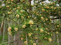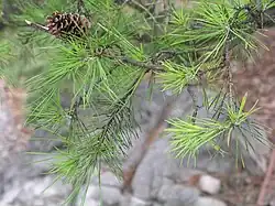 Die Nadeln stehen waagrecht zu zweit in einer bleibenden, basalen, 4 bis 10 Millimeter langen Nadelscheide und bleiben drei bis vier Jahre am Baum. Die hell-, dunkel- oder gelblich grünen Nadeln sind unelastisch und häufig stark verdreht, 3 bis 8 Zentimeter lang und 1 bis 1,5 Millimeter breit, mit breit dreieckigem Querschnitt. Der Nadelrand ist fein gesägt, das Ende schmal spitz. Auf allen Nadelseiten gibt es unauffällige Spaltöffnungslinien. Je Nadel werden zwei mittig verlaufende Harzkanäle gebildet.[2][3]