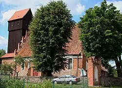 In der Handfeste vom 14. Dezember 1335 wird dem Dorfpfarrer freie Fischerei in zwei Seen verliehen; bis 1363 wirkte Petrus Gernich als Pfarrer, nach ihm Johannes Jordan.[17] Mit Ausnahme seines Turms wurde das Kirchengebäude um 1580 neu errichtet, wobei anscheinend altes erhalten gebliebenes gotisches Mauerwerk mit verwendet wurde, und von Bischof Martin Cromer auf den Namen des Apostels Bartholomäus geweiht.[3] Im 19. Jahrhundert hatte die Kirche eine Wetterfahne mit einer Ziege, dem Wappen des Bischofs Szembek.[3]