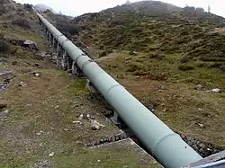 Eine Triebwasserleitung ist eine spezielle Bezeichnung einer Pipeline im Anwendungsgebiet der Wasserkraft. Sie verbindet Wasserspeicher und Krafthaus eines Wasserkraftwerkes, wie z. B. bei einem Pumpspeicherkraftwerk, auf dem kürzesten Weg.[31]