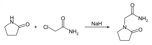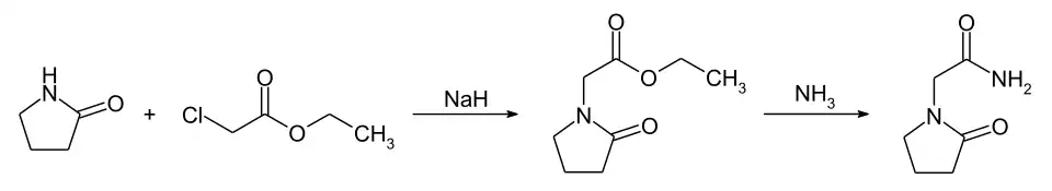 Die Synthese geht von 2-Pyrrolidon aus, welches nach einer Deprotonierung mittels Natriumhydrid mit Chloressigsäureethylester umgesetzt wird. Im Folgeschritt erhält man die Zielverbindung durch Umwandlung des Esters zum Amid mittels Ammoniak. Eine einstufige Synthese ist durch die Verwendung von Chloracetamid möglich.[5]