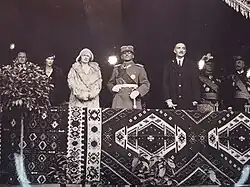 Ein symbolischer Bedeutungszuwachs erwuchs dem Piroter Kelim unter König Aleksandar Obrenović, der 1902 eine Kelim-Gesellschaft initiierte, und Königin Draga Mašin, die sich stark für die Volkstradition einsetzte und Vladislav Titelbah einen Katalog Piroter Kelime anfertigen ließ. Gleichzeitig wurde dieser zur Dekoration der Residenzen eingeführt.[28] Mit der Wiederankunft Peters I. aus seinem Exil in den mit Piroter Kelimen feierlich geschmückten Halle des Belgrader Hauptbahnhof, wurde die formelle, repräsentative Funktion vergleichbar französischer Tapisserie,[29] bei Staatszeremonien deutlich.[30] So fanden auch die Thronreden des serbischen und später jugoslawischen Königs Alexander I. im Haus der Nationalversammlung in einem festlich mit Piroter Kelimen geschmückten Plenarsaal statt.[31] Während der Einweihung der Bronze-Skulptur Dank an Frankreich am 11. November 1930 zum Gedenken an den Waffenstillstand von Compiègne war durch Aushängen von Piroter Kelimen an den Häusern Belgrads,[32] wie der mit Piroter Kelimen feierlich geschmückten königlichen Loge und dem von Kelimen umgürteten Podest des Meštrović-Denkmals diesem eine Staatsinsignien vergleichbare Rolle zugedacht.