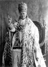 Pius X. (* 2. Juni 1835 in Riese, Lombardo-Venetien, als Giuseppe Melchiorre Sarto; † 20. August 1914 in Rom) war von 1903 bis 1914 der 257. Papst der römisch-katholischen Kirche. Er wurde 1954 von Papst Pius XII. heiliggesprochen. Pius X. wird häufig als „konservativer Reformpapst“[1] bezeichnet, weil er sich entsprechend seinem Wahlspruch Instaurare omnia in Christo („Alles in Christus erneuern“) um innerkirchliche Reform und Erneuerung bemühte, um die katholische Kirche im Kampf gegen Einflüsse der Moderne zu stärken.