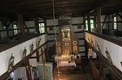 Die römisch-katholische Filialkirche Mariä Himmelfahrt wurde 1786 nach Plänen des Architekten Christian Isemer vom Zimmermeister Petzer errichtet. 1790 wurde der niedrige Glockenturm mit welscher Haube angebaut.[7] Der Fachwerkbau wird von einem hohen Walmdach bedeckt. Im schlichten Inneren erstreckt sich unter der Balkendecke eine dreiseitige Empore, auf der die Orgel von vor 1794 aufgestellt ist. Ebenso wie der Altar (um 1790) ist sie in einem Übergangsstil vom Rokoko zu Klassizismus gehalten.[14]