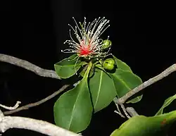 Es werden traubige Blütenstände mit einigen Blüten gebildet. Die gestielten, zwittrigen und sehr kurzlebigen Blüten sind vierzählig mit doppelter Blütenhülle. Die etwa 0,8–1,5 Zentimeter langen Blütenstiele sind feinflaumig. Das außen feinflaumige Hypanthium ist becherförmig und mit einem „Gelenk“ vom Blütenstiel getrennt. Es sind kleinere Vorblätter vorhanden. Die kleineren, außen feinflaumigen, weichledrigen und etwas ungleichen Kelchzipfel sind eiförmig bis länglich, abgerundet bis spitz und grünlich. Die Kronblätter sind weißlich-grün und länglich bis verkehrt-eiförmig. Die Blüten besitzen viele (100–140) lange, ungleiche, an der Basis röhrig verwachsene und im unteren Teil rötliche bis oben weiße Staubblätter und einige Staminodien.[1] Der mehrkammerige Fruchtknoten ist unterständig mit einem langen, leicht konischen Griffel. Es ist ein ringförmiger Diskus vorhanden.