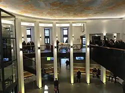 Die „Wandelhalle“ wurde von der Malerin Dorothea Maetzel-Johannsen im Geschmack der Zeit ausgestaltet. Sie starb jedoch während der Arbeit, so dass Heinrich Groth die Malereien vollendete. Die Ausstellung im unteren Stockwerk war im Laufe der Zeit einem beständigen Wandel ausgesetzt und konnte so immer wieder den unterschiedlichen Interessen der Besucher und der Planetariumsleitung angepasst werden. Dominierte zu Beginn noch die Geschichte der Astronomie den Inhalt, verschob sich der Schwerpunkt im Laufe der Zeit immer mehr in Richtung Raumfahrt und Erforschung des Sonnensystems. Ende der 1990er-Jahre waren im unteren Teil Raumfahrtmodelle, Meteoriten, eine Vielzahl von Aufnahmen der Erde und des Sonnensystems sowie einer der zu dieser Zeit größten Mondgloben der Welt ausgestellt.