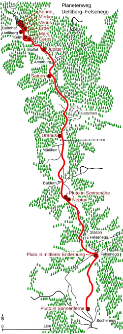 Zwergplanet Pluto ist wegen seiner stark elliptischen Bahn mit drei Stationen vertreten: Die erste Position entspricht dem Perihel, dabei liegt er noch vor dem Neptun. Die zweite Position bei Felsenegg entspricht der mittleren Entfernung und die dritte Station nahe Buchenegg dem Aphel.