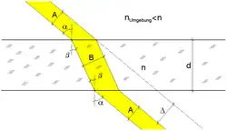 Bei schrägem Einfall erfährt ein Lichtstrahl an beiden Grenzflächen der Planplatte eine Brechung. Dabei ist der Austritts-Winkel gleich dem Eintritts-Winkel , und der Austritts-Querschnitt gleich dem Eintritts-Querschnitt des Strahles. Der austretende Strahl ist aber parallel gegenüber dem einfallenden um den Abstand verschoben. Es gilt