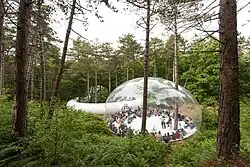 Die Architektur von LOUD SHADOWS | LIQUID EVENTS bietet vier unterschiedliche Bühnen an. Jeder einzelne Baum des Waldes in dem Gebiet Formerum auf der Insel Terschelling wird bei der Arbeit mit einbezogen und berücksichtigt. Jedes Element dieses standortspezifischen Projekts ist in seine Umgebung integriert: Die erste transparente kugelförmige Blase wird von einem Baum durchbohrt, während die zweite milchig-transparente Blase zwischen den Ästen der Bäume platziert wird. Diese Äste werfen wiederum einen Schatten auf die Blase. Der Ring, der die beiden Blasen verbindet, schlingt sich um Kiefern- und Eichenbäume und bildet Raum für die dritte Bühne. Die vierte Bühne ist der Wald um die Installation herum. Innerhalb dieser Konstellation kann das Publikum frei zirkulieren.