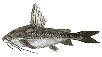"Silurus costatus", jetzt Platydoras costatus, Darstellung von Gronow 1754 | ||||||||||||