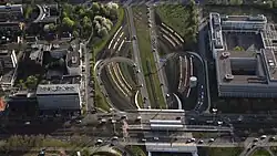 In der Folge entstanden drei Brücken für die B 9 und die mittig verlaufende Stadtbahnstrecke Bonn–Bad Godesberg der Stadtbahn Bonn mitsamt aufwändig gestalteter Haltestelle, je zwei Rampen und „Ohren“ sowie ein Lüftungsgebäude für die Klimaanlage des Landesbehördenhauses.[3] Das nach Plänen des Ateliers von Johannes Dinnebier ausgeführte Beleuchtungskonzept[4] wurde noch während der Bauphase geändert. So wurden nur die vier (von zwölf geplanten) Lichtstelen aufgestellt, deren Fundamente bereits gut sichtbar betoniert worden waren. Während der Bauzeit wurde der Name des Knotens erneut geändert. Die Bezeichnung lautete zu diesem Zeitpunkt Platz der Vereinten Nationen, weswegen in den „Ohren“ zu besonderen Anlässen die Fahnen aller damaligen Mitgliedstaaten der Vereinten Nationen wehen.