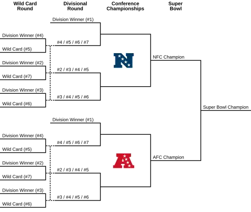 In den beiden Conferences werden zunächst getrennt die Sieger ausgespielt. Die erste Runde der Play-offs wird als Wild Card Round bezeichnet. In dieser Runde empfangen der Divisionssieger mit Nr. 2 das Wildcard-Team mit Nr. 7, der Divisionssieger mit Nr. 3 das Wildcard-Team mit Nr. 6 und der Divisionssieger mit Nr. 4 das Wildcard-Team mit Nr. 5. Der Divisionssieger mit Nr. 1 hat ein Freilos, d. h., er steht automatisch in der 2. Runde, der Divisional Round, und hat dort Heimrecht gegen einen der Sieger der Wild Card Round. Im Gegensatz zur NBA hat die NFL keinen fix vorgegebenen Spielplan, sondern es spielt in jeder Runde das jeweils am höchsten gesetzte Team gegen das am niedrigsten gesetzte Team.[2] Die beiden Sieger der Divisional Round stehen sich dann im jeweiligen Conference Championship Game gegenüber. Sie ermitteln dabei nicht nur den Sieger der Conference, sondern auch den Teilnehmer am Super Bowl. Bei den Ansetzungen genießt jeweils das höher gesetzte Team Heimrecht. Eine Ausnahme hiervon bildet der Super Bowl, bei dem das Heimrecht jährlich zwischen NFC und AFC wechselt. Nur dreimal seit 1990 hat ein Team, das nicht als Nr. 1 oder 2 gesetzt war, das Heimrecht für das Conference Championship Game erreicht (AFC Championship 2006 und NFC Championships 2008 und 2021).