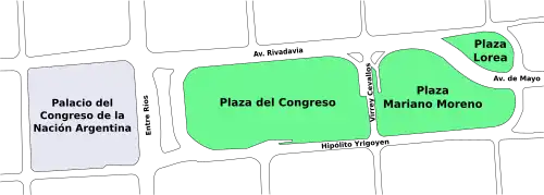 Die Einweihung des Kongresspalastes 1906, damals zwei Blöcke westlich der Plaza Lorea gelegen, machten aus ästhetischen und stadtplanerischen Gründen die Neuanlage eines adäquaten Platzes notwendig. Am 30. September 1908 unterschrieb Präsident José Figueroa Alcorta das Bundesgesetz 6286, mit dem das project beschlossen wurde. Der Landschaftsarchitekt und damalige Direktor der städtischen Parkanlagen Carlos Thays sah hierfür ein circa drei Hektar großes Grundstück vor dem Kongresspalast, parallel zur Avenida de Mayo vor, über das die Calle Montevideo führte. Der Entwurf von Thays wurde genehmigt, da für die Anlage nur wenige Gebäude abgerissen werden mussten.[3]