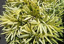 Weitere Synonyme der Art sind: Arundinaria auricoma Mitford, Arundinaria fortunei var. aurea (Carrière) Bean, Arundinaria variabilis var. viridistriata (Regel) Matsum., Arundinaria variegata var. viridistriata (Regel) Makino, Arundinaria viridistriata f. chrysophylla (Makino) Nemoto, Bambusa fortunei var. aurea Carrière, Pleioblastus auricomus (Mitford) D.C.McClint., Pleioblastus viridistriatus f. chrysophyllus Makino, Pseudosasa auricoma (Mitford) Bergmans, Sasa auricoma (Mitford) E.G.Camus, Sasa viridistriata (Regel) Fiori und Sasaella viridistriata (Regel) Nakai.[5]