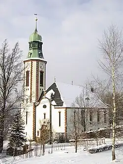 - Neobarocke Evangelische Kirche, 1903/1904 nach Entwürfen von Woldemar Kandler errichtet, mit Jehmlich-Orgel von 1904 und einem Altarbild von Ludwig Otto (Christi Himmelfahrt)