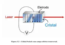 - Vor und hinter dem Kristall wird jeweils ein Polarisationsfilter angeordnet, deren Polarisationsebenen zueinander um 90 Grad gedreht sind. Durch Verändern der angelegten Hochspannung dreht der Kristall die Polarisationsebene des durchgehenden Lichts, wobei die Intensität zwischen 0 und 100 Prozent verändert werden kann. Damit lässt sich die Anordnung als schneller Schalter für Licht verwenden.