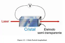 - Longitudinale Pockelszellen: Sie benötigen transparente Elektroden, häufig als Blenden ausgeführt. Die Spannung kann verringert werden, wenn eine Kette geschaltet wird: Elektrode-Kristall-Elektrode-Kristall-Elektrode usw.