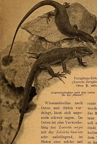 - ↑ Willi Schmitz: Die Faraglione-Eidechse. In: Blätter für Aquarien- und Terrarien-Kunde. Stuttgart 1890, S. 171.
