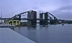 2007 war eine Verbindungsbrücke von der Rybalskyj-Insel zum Stadtgebiet Podil beim Flusshafen von Kyiw fertig gebaut. Werften, Wohnsiedlungen und auch die Hafenverwaltung mussten dem Bau der Hochbrücke und Zufahrtsrampen weichen.