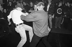 Ursprünglich bestand der Pogo-Tanz Ende der 1970er nur aus unkontrolliertem In-die-Luft-Springen.[3] Doch mit der immer aggressiveren Musik, die sich aus dem Punkrock entwickelte, wurden auch die Bewegungen zu der Musik immer heftiger. Besonders in der Hardcore-Szene setzte sich das Slamdancing (s. u.) durch.