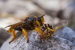 Die Raubfliegen leben räuberisch in Baum- und Strauchgruppen. Sie lauern sitzend ihrer Beute auf. Die Raubfliegen sind sehr gute Flieger und ergreifen mit ihren kräftigen Vorderbeinen ihre Beute im Flug. Bevorzugt erbeuten sie Wespen und Bienen. Sie stechen ihre Beute mit dem spitzen Rüssel an und saugen sie anschließend aus. Auch die Larven, die sich in morschem Holz entwickeln, leben räuberisch. In den Fraßgängen anderer Insektenlarven jagen sie hauptsächlich Käferlarven. Für den Menschen sind diese Raubfliegen harmlos. Sie stechen nur im äußersten Notfall. Ihr Stich ähnelt einem Wespenstich. Die Raubfliegen kann man von Juni bis September beobachten.