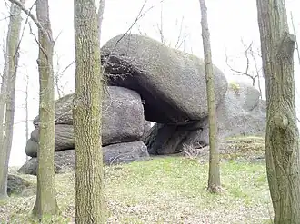 Die von einem Laubwäldchen umgebene Gruppe besteht aus sechs mächtigen Felsblöcken aus Rumburger Granit (50° 58′ N, 15° 1′ O), von denen fünf zusammen stehen, wobei einer, der Opfertisch, auf zwei anderen liegt und ein offenes Felsentor bildet. Der sechste Block steht getrennt durch einen Durchgang für zwei Personen abseits vom Hauptfelsen. Ursprünglich lag auf dem Hauptgebilde noch ein siebter Felsblock, der jedoch irgendwann abstürzte und zerbarst.