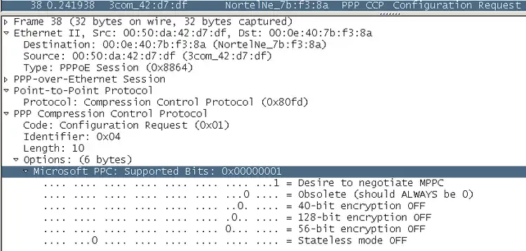 Über das Compression Control Protocol (CCP) wird die Datenkompression für die Verbindung eingestellt. Der Client schlägt hier die Microsoft Point-to-Point-Compression (MPPC) vor.