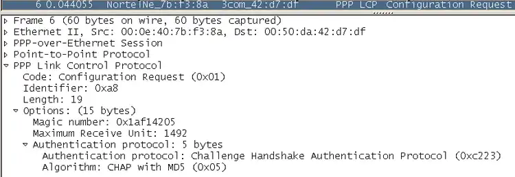 Als Nächstes schlägt der PoP über ein LCP Configuration Request das Authentifizierungs-Protokoll CHAP und eine Maximum Receive Unit (MRU) von 1492 Byte vor. Die MRU ist durch den PPP-Header um 8 Byte kleiner als die maximal mögliche MTU von 1500 Byte.