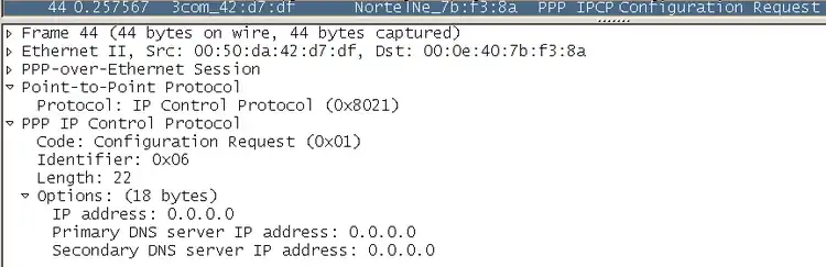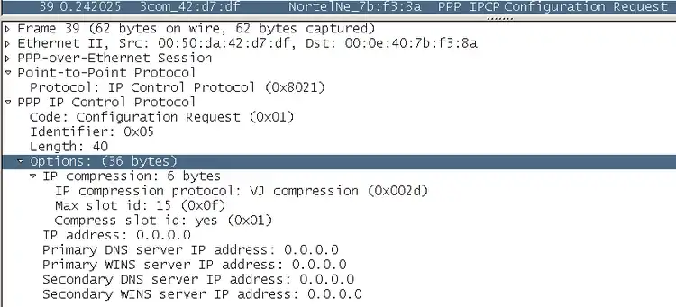 Rot gekennzeichnet sind hier Empfänger (steht immer rechts) und Sender (steht immer links). Empfänger und Sender besitzen immer MAC-Adressen. Jedes Paket besitzt auch eine ID (grün gekennzeichnet). Dadurch ist gewährleistet, dass zu jeder Anfrage (Request) die richtige Antwort zugeordnet wird, da das Frage-und-Antwort-Spiel meist verschachtelt abläuft. Als Client wird hier der Rechner des Internetnutzers und als PoP („Point of Presence“) der Remote Access Server des Internet Service Providers (ISP) bezeichnet. PoP ist in unserem Beispiel NortelNe_* und Client ist 3Com_*. Blau gekennzeichnet ist das Options-Feld des PPP-Rahmens. Dort werden Daten- und Optionen eingetragen. Auf dieses Feld wird sich ausschließlich bezogen.
