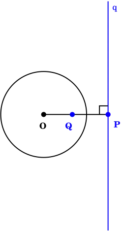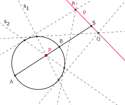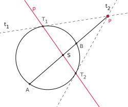 Zu einem Punkt , der im Äußeren[1] eines nicht entarteten Kegelschnitts (im Bild: eines Kreises) liegt, gibt es stets zwei Tangenten und , die durch gehen. Berühren diese den Kegelschnitt in den Punkten und , so heißt die Gerade „die Polare zu (bezüglich des gegebenen Kegelschnitts)“.