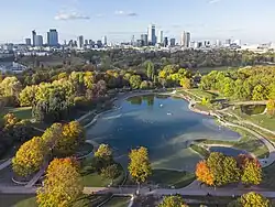 Nach dem Krieg wurde im nun als Park gestalteten Gelände der Neubau der Polnischen Nationalbibliothek errichtet. Ebenfalls entstand am Rande des Parks ein dreiflügeliges Gebäude für das polnische Haupt-Statistikamt. Auch wurden verschiedene Sportanlagen in Parknähe angelegt. Die meisten Bäume des Parks wurden erst in den 1940er und 1950er Jahren gepflanzt. In den 1970er Jahren wurde der Park noch einmal neu arrangiert. Heute ist der Park ein beliebtes Ausflugsziel für Anwohner, wegen der angrenzenden Universitäten (Szkoła Główna Handlowa und TU) ist er auch Aufenthaltsplatz für Studenten. Es gibt rund 10 Bars und Restaurants im Park. Besonders in den Sommermonaten finden im Park häufig Großveranstaltungen (Kultur, Sport, Unterhaltung) statt. Neben dem Gedenkstein für den ehemaligen Flughafen gibt es ein neueres Hundedenkmal („Pomnik Szczęśliwego Psa“)[2] und im äußersten Nordost-Zipfel ein Denkmal der polnischen Kavallerie. Wegen der hochwertigen innenstadtnahen Lage sind die Randflächen des Parkes attraktiv für Immobilienentwickler. In den letzten Jahren kam es deshalb vermehrt zu öffentlichen Auseinandersetzungen über eine weitere Entwicklung des Geländes[3].