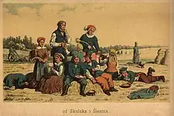Polnische Bauern und Bäuerinnen aus der Umgebung von Kalisz (Großpolen), Lithografie von 1881