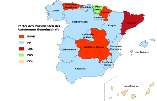 Gesamtspanische Parteien sind der sozialdemokratische PSOE, der konservative PP, Podemos und Ciudadanos (C’s) und die linkssozialistische IU. Die Regionalparteien werden in den jeweiligen Abschnitten kurz erläutert.