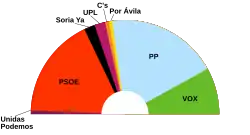 | Partei | PP | PSOE | VOX | UPL | Soria ¡Ya! | Unidas Podemos | C's | Por Ávila |