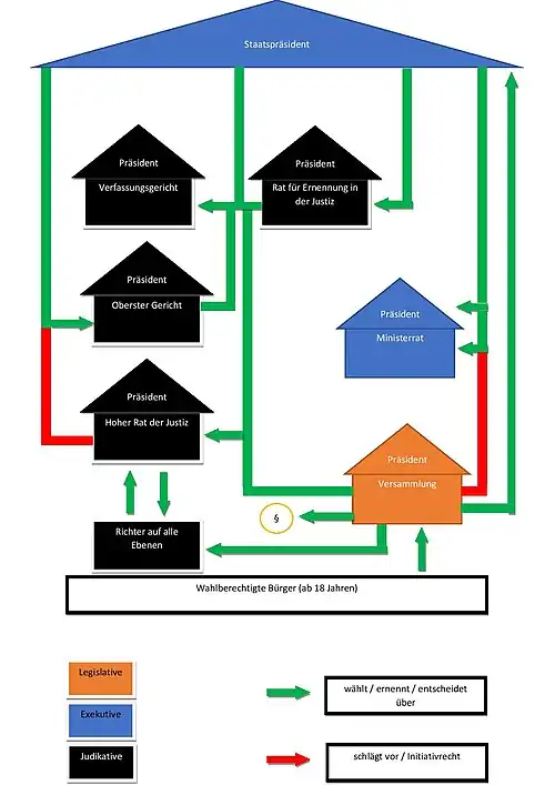 Zusammen mit dem Premierminister übt der Staatspräsident die Kontrolle über die Streitkräfte aus.[2] Das Parlament wählt den Präsidenten mit der Mehrheit von drei Fünfteln seiner Mitglieder in geheimer Wahl für eine Dauer von fünf Jahren.[4] Zur Wahl wird zugelassen, wer von mindestens 20 Abgeordneten unterstützt wird.[2] Die Ausübung des Präsidentenamts ist auf maximal zwei Perioden zu je fünf Jahren begrenzt.[4] Der Präsident ernennt dann den Premierminister auf Vorschlag der Mehrheit der Parlamentsabgeordneten. Sofern sich das Parlament in drei Anläufen nicht auf einen Vorschlag einigen kann, hat der Präsident das Recht, das Parlament aufzulösen.[2]