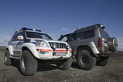 Die isländischen Polizeifahrzeuge sind weiß mit reflektierenden Markierungen in blau und rot. Sie tragen an den Längsseiten den isländischen Polizeistern und den blauen Schriftzug Lögreglan. Die Rundumkennleuchten sind blau.[10]