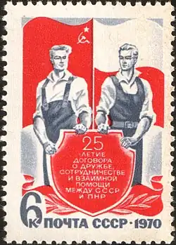 Durch den Molotow-Ribbentrop-Pakt von 1939 vereinbarten die Sowjetunion und NS-Deutschland unter Hitler die Aufteilung Polens. Der sowjetische Einmarsch in Ostpolen, der hauptsächlich von ukrainischen Einheiten der Roten Armee unter Semjon Timoschenko durchgeführt wurde, ermöglichte es der Sowjetunion, einen Großteil Ostpolens an die Ukraine und Weißrussland anzugliedern.[8] Die meisten Offiziere der polnischen Streitkräfte, die von der Sowjetunion gefangen genommen wurden, wurden getötet, während viele Soldaten in Gulags kamen. Die folgenden Jahre sowjetischer Repressionen gegen polnische Bürger, insbesondere der brutale Massenmord an mehr als 20.000 polnischen Offizieren, Polizisten und Intellektuellen im Jahr 1940, der als Massaker von Katyn bekannt wurde, und die anschließende sowjetische Verleugnung für 50 Jahre, wurden zu einem weiteren Ereignis mit nachhaltigen negativen Auswirkungen auf die polnisch-russischen Beziehungen.[9] Nach dem Angriff der Deutschen auf die Sowjetunion wurden die Sowjets und die Polen wieder zu nominellen Verbündetend und kooperierten bei der Bekämpfung der Deutschen. Der Aufstand der polnischen Heimatarmee 1944 in der Hauptstadt fiel zeitlich mit der Lublin-Brest-Offensive der Roten Armee und der 1. Polnischen Armee auf die östlichen Vororte der Stadt und dem Rückzug der deutschen Truppen zusammen. Die Rote Armee kam den Aufständischen in Warschau aber nicht zu Hilfe und ließ Warschau der kompletten Zerstörung durch die Deutschen mit bis zu 200.000 Toten anheimfallen, mutmaßlich da Stalin die Heimatarmee als potenzielles Hindernis zur Errichtung einer sowjetischen Herrschaft ansah.[10] Die Umstände der „Befreiung“ Warschaus durch die Sowjets belasteten die gemeinsamen Beziehungen ebenfalls nachhaltig.