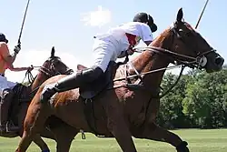 Die Steigbügelriemen werden eher kurz geschnallt. Der Spieler dreht sich beim Schlag zum Ball, steht aber nicht klassisch in den Steigbügeln, sondern dreht sich im Sattel und stützt sich auf seine fest geschlossenen Knie. Entweder schlägt er den Ball in der Position des Halbsitzens („half-seat“) oder aber sitzend im vorderen Teil des Sattels. Wichtig ist die Drehung zum Ball, die man bei allen Top-Spielern sieht.