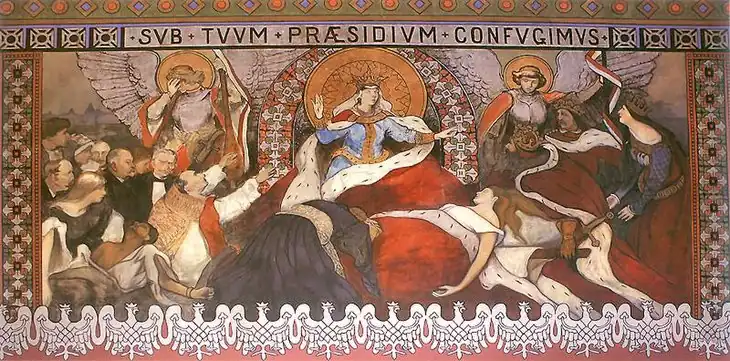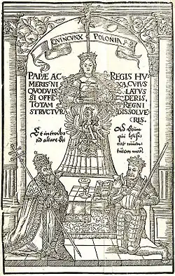 In Folge der siegreichen Verteidigung des Klosters Jasna Góra in Tschenstochau gegen die schwedischen Truppen (der Sieg wurde angesichts der Übermacht der Angreifer als ein Wunder der Schwarzen Madonna gedeutet), erklärte der polnische König Johann II. Kasimir 1656 im Dom von Lemberg die Muttergottes zur Regina Polonia (Königin der polnischen Krone).[1] Die Bedeutung der säkularen und klerikalen Identifikationsfiguren überlagerten sich ähnlich wie es schon im Römischen Reich bei Roma und Minerva der Fall gewesen war.